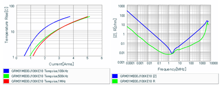 表示100kHz、500kHz、1MHz中交流电流与温度上升的关系和阻抗(Z)及ESR®与频率的关系。可确认发热特性按100kHz>500kHz>1MHz的顺序逐渐变小。此外,ESR在100kHz时为10mΩ,在500kHz时为6mΩ,在1MHz时为5mΩ,可确认ESR与发热特性的密切关系。